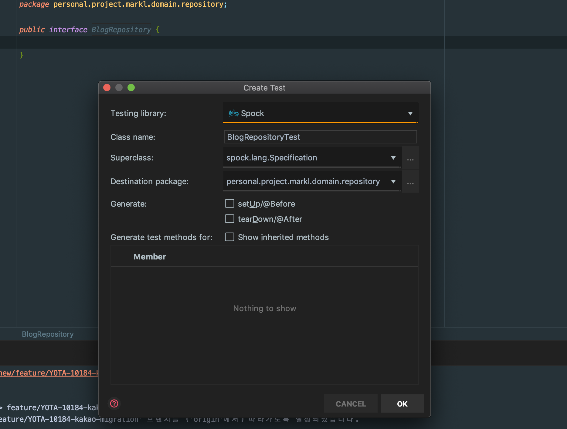 spock의 경우 기본경로가 java package가 아닌 groovy package를 사용합니다. 아래와 같이 intellij에서 test를 생성하면 Testing library로 Spock을 선택할 수 있게 됩니다. 이렇게 Spock을 선택한 후 OK를 하게되면 test의 groovy package의 하위로 package가 설정되어 만들어지게 됩니다.
