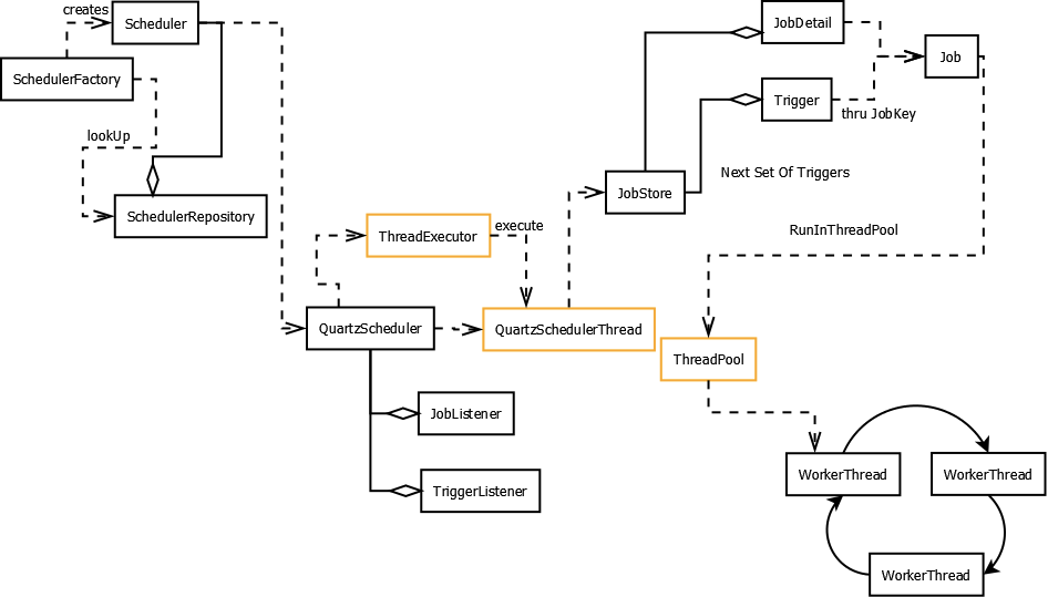 위의 구현을 보니 어떠신가요? Spring Scheduler에 비해서 Quartz가 훨씬 배우기 어렵다는 사실이 느껴지셨나요? 아래는 Quartz의 내부 구조도입니다. 이와 같이 Quartz는 Scheduler에서 일어날 수 있는 다양한 기능을 제공해줍니다. 따라서 구조도 일반 Scheduler에 비해서는 조금 복잡하다라는 것을 알 수 있습니다.
