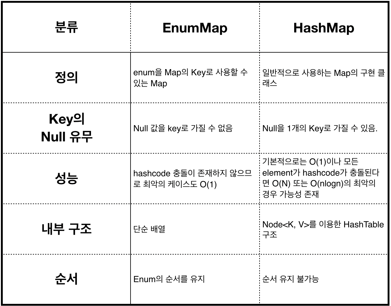 아래는 HashMap과 EnumMap을 비교한 표 입니다.