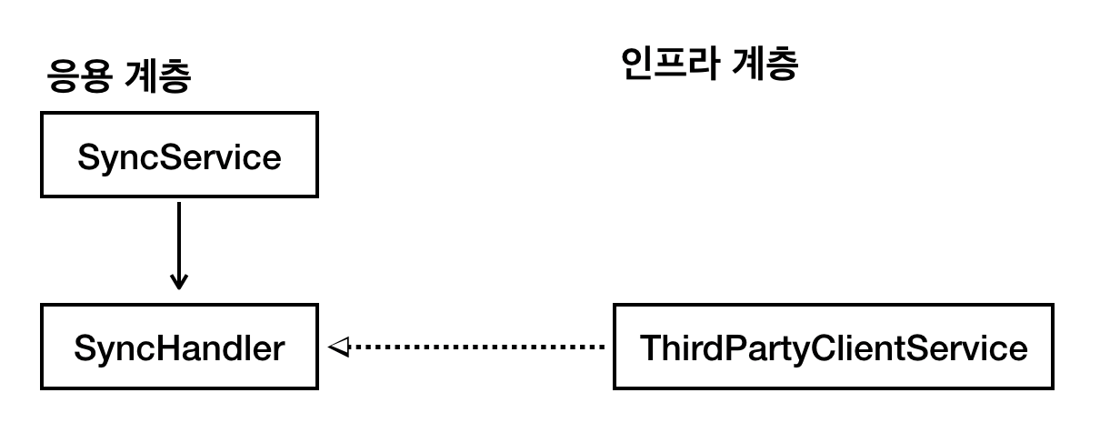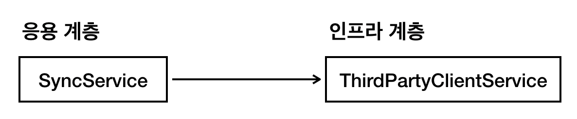 위 코드는 정상으로 동작하며 테스트도 잘 됩니다. 하지만 확장성 측면에서 본다면 문제가 있습니다. 바로 응용서비스인 SyncService가 ThirdParyClientService의 변화에 대해서 동시에 수정이 일어나야한다는 것입니다.