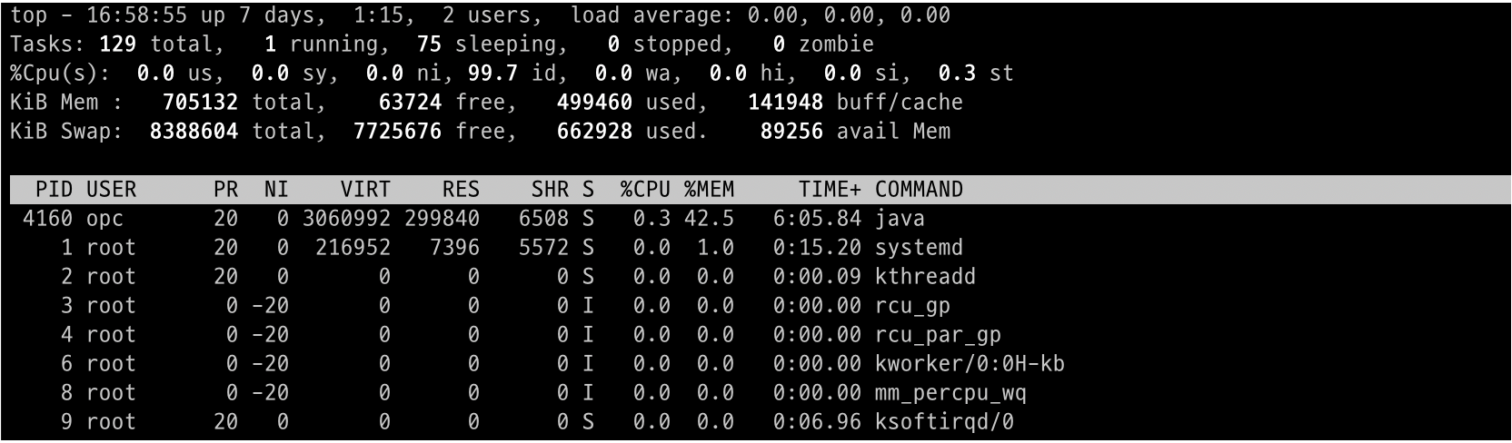 top 명령어는 현재 OS의 상태를 나타내주는 CLI 어플리케이션입니다. 메모리 사용량, CPU 사용량 등을 나타내주며 top를 실행하는 동안에는 주기적인 업데이트로 실시간에 근접한 내용을 보여줍니다. 리눅스에서 top 명령어를 실행하면 아래와 깉이 노출됩니다. 위에는 전체의 요약이 있으며 아래에는 각 프로세스마다 구체적인 내용을 포함하고 있습니다.