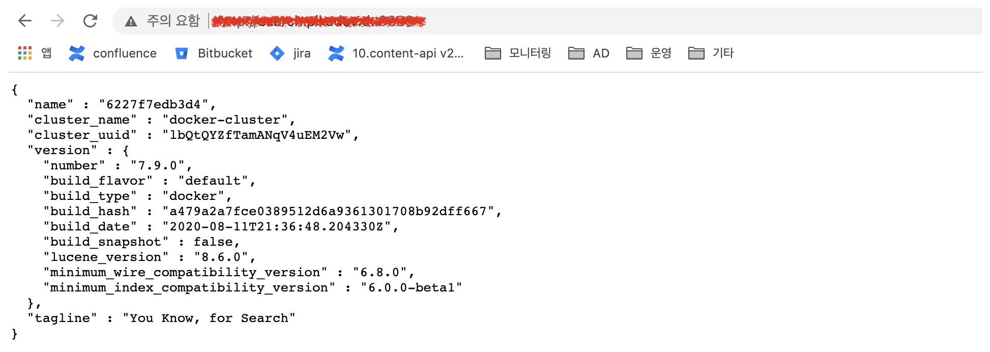 ## 오늘 실습은 ElasticSearch 서버가 실행되어있고 통신이 가능하다라는것을 전재로합니다. 확인할 수 있는 방법은 ElasticSearch에 접속했을 때 아래와 같이 노출되면됩니다.