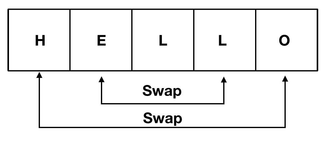 또다른 방법으로는 1번째와 마지막을 교환하고 2번째와 마지막 - 1 번째를 교환하고 중간까지 교환하는 방식이 있습니다. 이 방식을 사용하면 시간복잡도는 O(N)이지만 실질적으로는 N/2 만큼 연산이 이루어집니다. 또한 해당 배열에서만 Swap이 이루어지면 되므로 추가적인 메모리도 사용되지 않습니다. 이미지로 나타내면 아래와 같습니다.