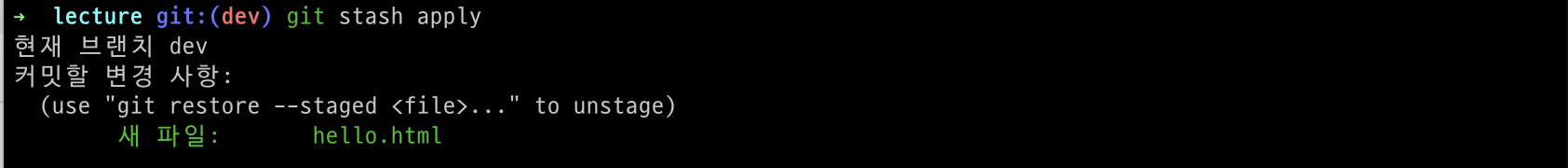 갑작스럽게 들어온 작업이 끝나고 다시 원래 진행하고 있던 작업으로 돌아가도록 하겠습니다. 이 작업은 stash apply라는 명령어를 사용하면 가능합니다.