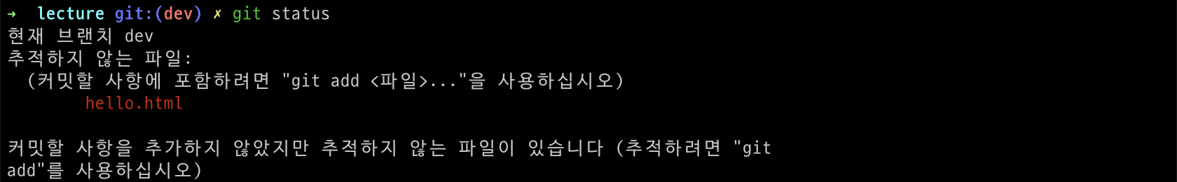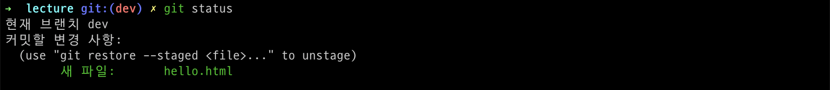 먼저 file을 추가한 후 add 명령어를 이용하게 되면 해당 파일은 index area에 들어가며 tracked 상태가 됩니다. 아래 처럼 status 명령어를 통해 확인이 가능합니다.
