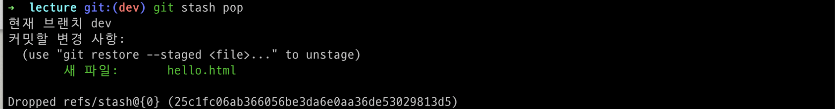 apply와 drop을 동시에 해주는 명령어가 있습니다. 바로 pop 명령어입니다. 해당 명령어를 사용하면 stash에서 정보를 가져온 후 바로 해당 stash를 삭제합니다.