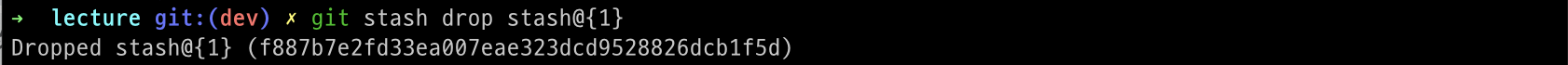 그리고 apply를 한다고 해서 stash가 삭제되지 않고 계속 쌓입니다. 필요없는 stash를 제거하기 위해서는 별도의 명령어가 필요한데요. 바로 drop 명령어입니다. 아래처럼 stash@{번호}를 통해 더 이상 사용하지 않는 stash를 삭제할 수 있습니다.