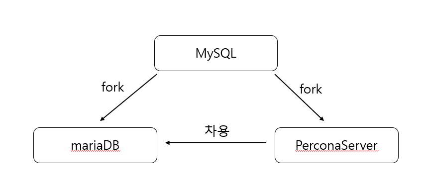 mysql을 기반으로 fork하여 자체적으로 개발하는 서비스로 mariaDB 뿐만이 아니라 PerconaServer도 있다고 합니다. 이들간의 관계를 한번 보도록 하겠습니다.