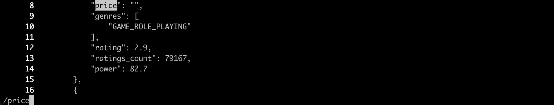 less 명령어를 입력한 후 명령어가 실행중에 /{찾을 키워드}를 입력하면 찾기 기능을 사용할 수 있습니다. 아래 이미지가 less 명령어 중 price로 찾기 명령어를 수행한 결과입니다.