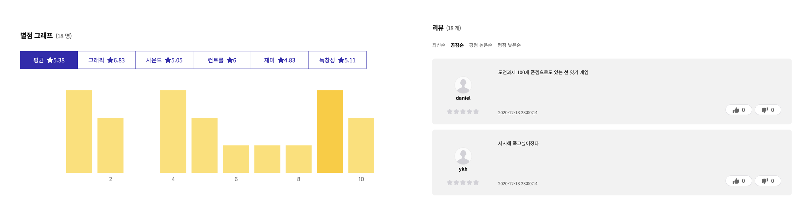 게임에 대한 리뷰 부분입니다. 이 페이지는 별도로 존재하진 않았고 게임 상세페이지에 함께 들어가 있었습니다. 이 영역에서는 리뷰에 대한 전체적인 추세를 볼 수있는 차트와 리뷰내용을 볼 수 있는 리스트로 구성하였습니다. 이러한 정보들은 모두 RDB를 이용하여 처리하였습니다.