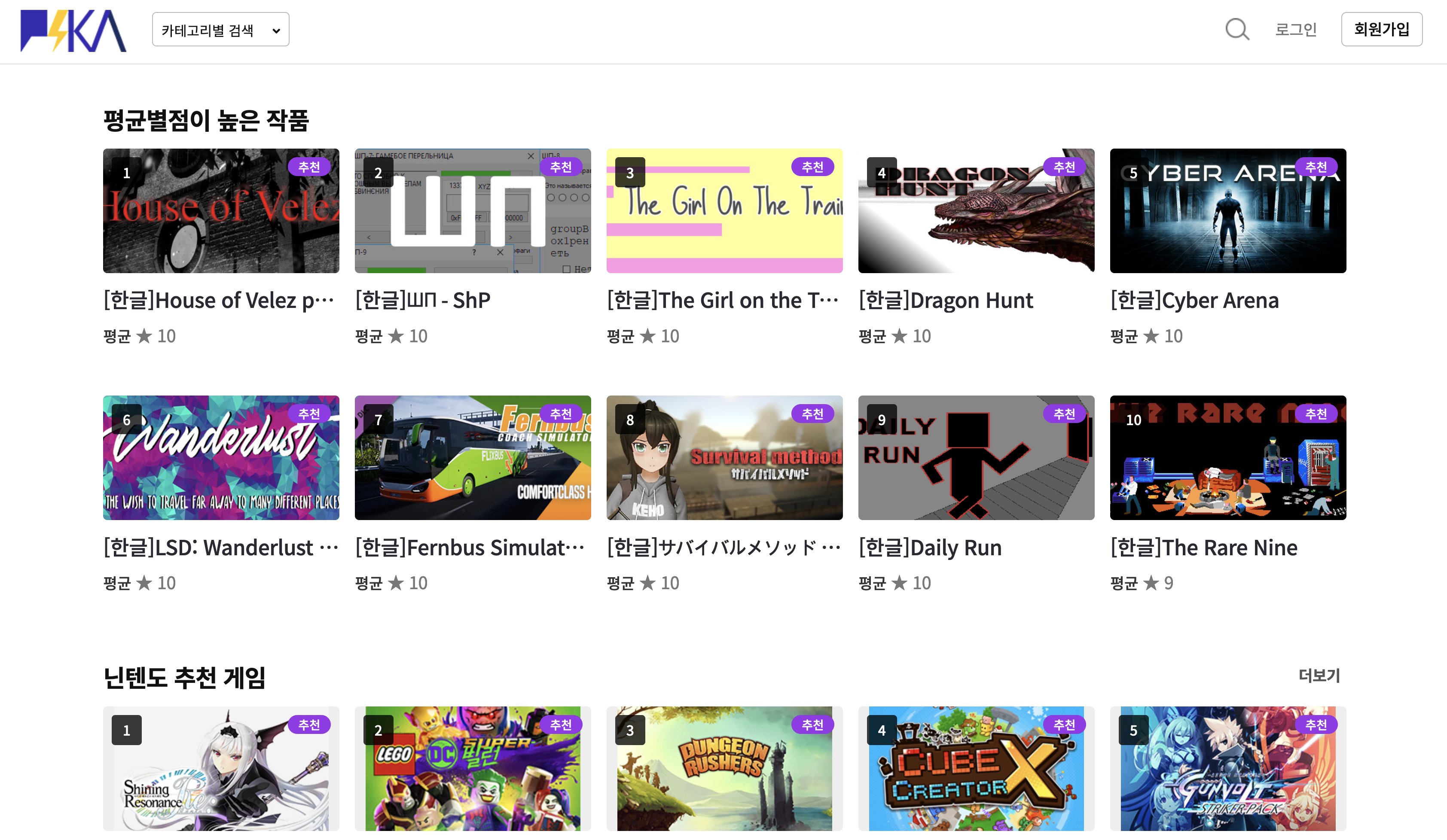 게임 리스트 페이지는 저희의 페이지에 들어가면 볼 수 있는 첫 화면입니다. 게임의 리스트와 각 플랫폼 별 게임 리스트를 가져와서 랭킹별로 보여주고 있습니다. 여기에 추가적으로 더보기 버튼을 이용하여 해당 버튼을 누르면 관련된 모든 게임을 볼 수 있었습니다. 게임 리스트에서는 게임의 이름과 평점, 그리고 썸네일이 노출되게 됩니다. 또한 이 정보들은 정렬 순서로 추천순, 이름순으로 볼 수 있도록 제공해주고 있었습니다. 이러한 정보들은 지속적으로 DB를 읽어오는 것 보다 redis를 이용해 먼저 데이터를 저장해 둔 후 반환하는게 더 이득이라고 판단하여 순서에 대한 부분은 redis를 이용하였습니다.