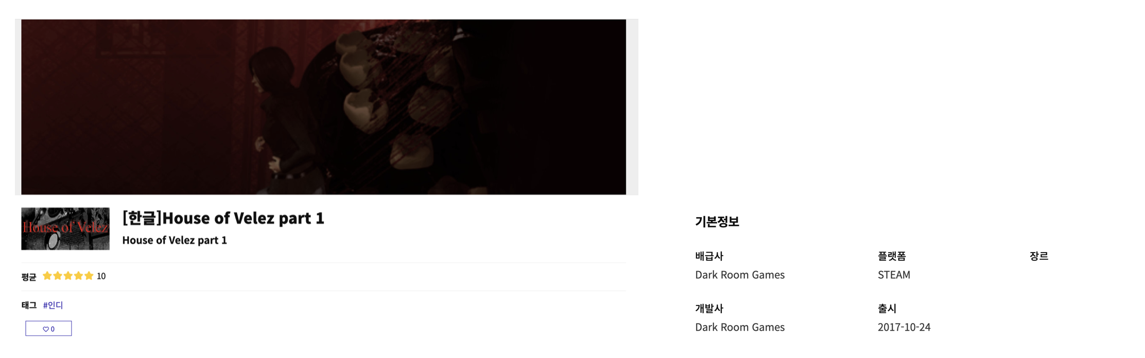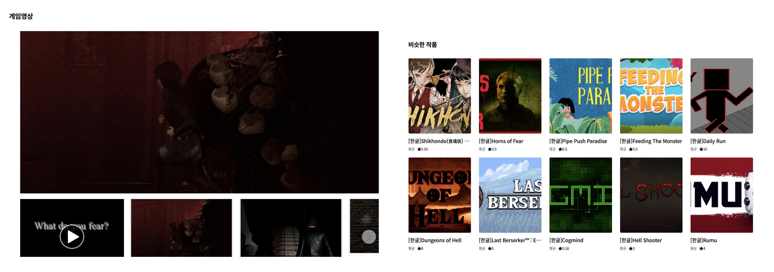 게임 상세페이지는 리스트의 게임중 하나를 클릭했을 때 나타나는 페이지입니다. 이 페이지에서는 게임에 대한 설명과 영상, 이미지, 리뷰, 그리고 이와 비슷한 게임을 나타내는 페이지입니다. 사이트의 기준에 맞도록 게임의 장르를 분류하였고 해당 게임만이 가지고 있는 특이점은 태그로 나타내었습니다. 이러한 정보들은 저희가 직접 입력한 부분은 없었으며 공식 홈페이지에서 크롤링하여 정보를 가져와 자동으로 값을 넣어주었으며 활용하였습니다. 비슷한 작품은 장르 및 태그의 유사성으로 판단하였습니다.