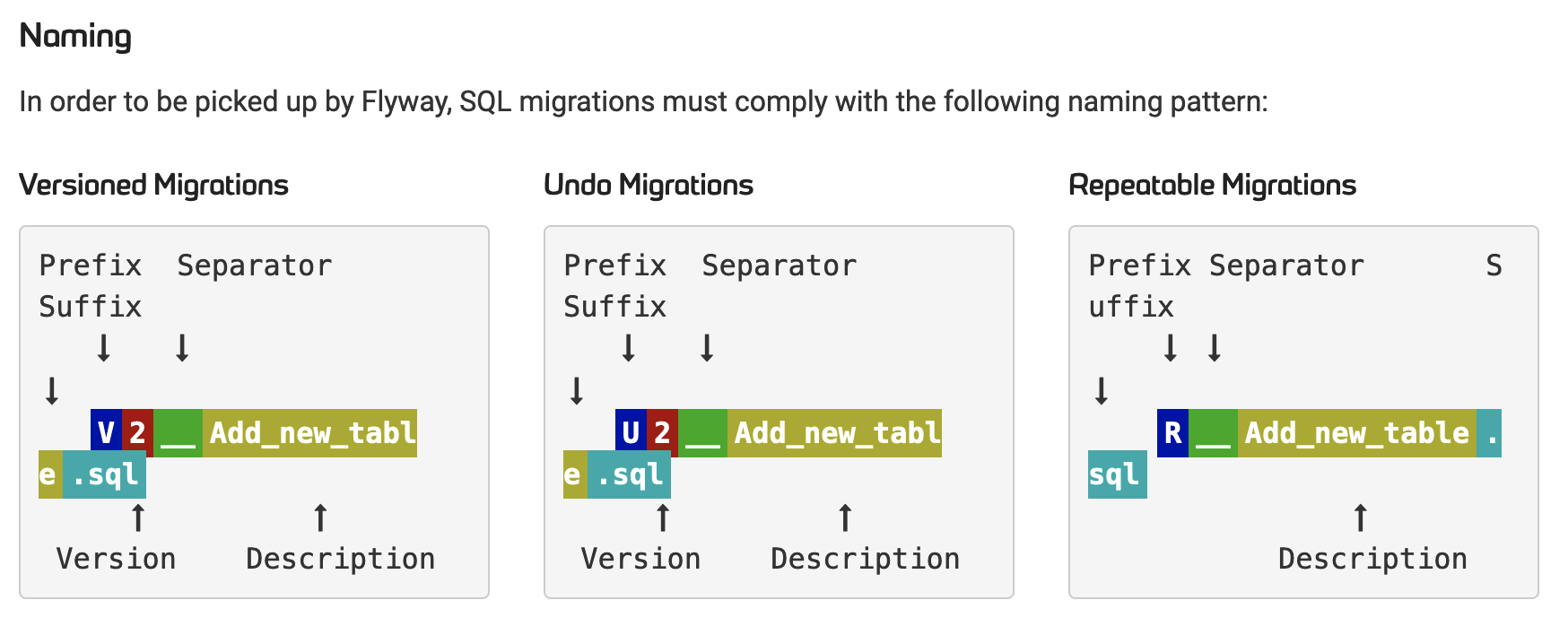 flyway에서는 데이터베이스에 일어나는 모든 행위를 마이그레이션(migration) 이라고 표현하고 있습니다. 이러한 마이그레이션은 파일로 관리되어 집니다. 파일의 이름은 지정하는 형식이 있으며 이를 따라야합니다.