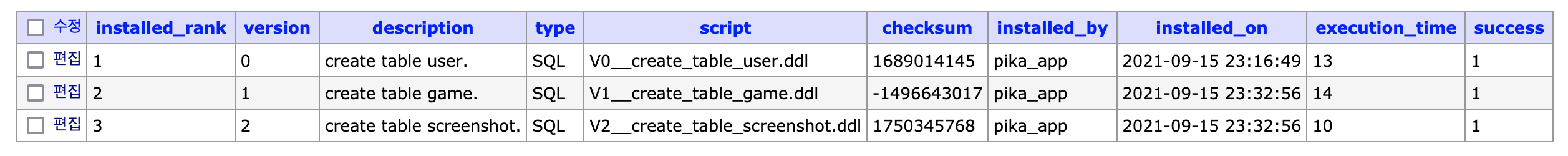 - success는 파일 실행에 성공했는지 여부를 나타내는 값입니다. 이 값에 따라서 flyway에서 해당 파일의 내용을 실행할지 말지 정합니다.