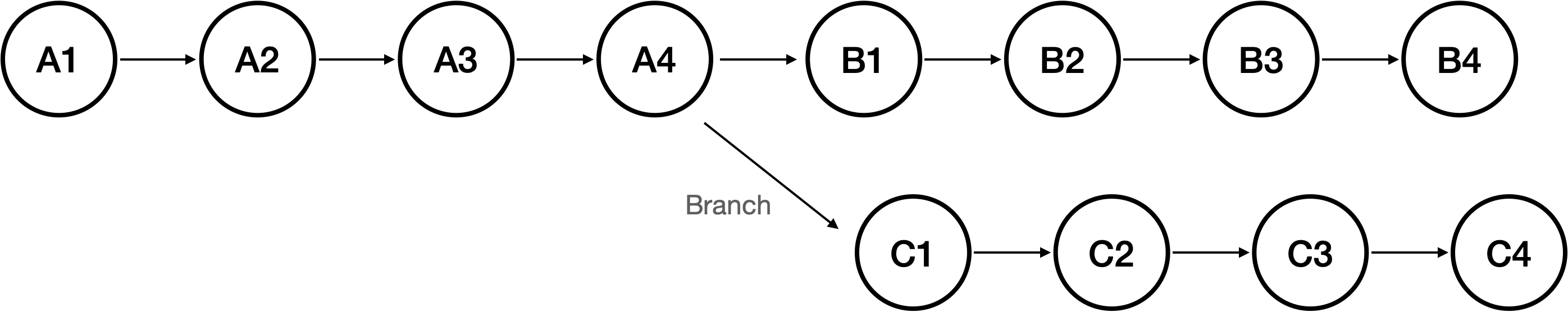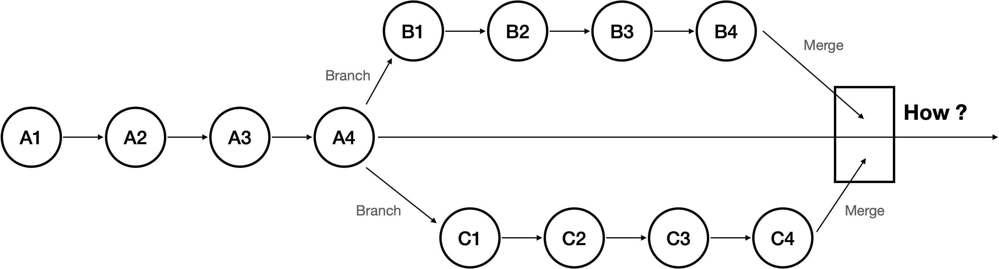 위 이미지는 위쪽으로 뻣어나갔던 branch만 병합했을때 나오는 git log 입니다. 보시면 그대로 base 브런치의 미자막이었던 A4에 붙는것을 확인할 수 있습니다.