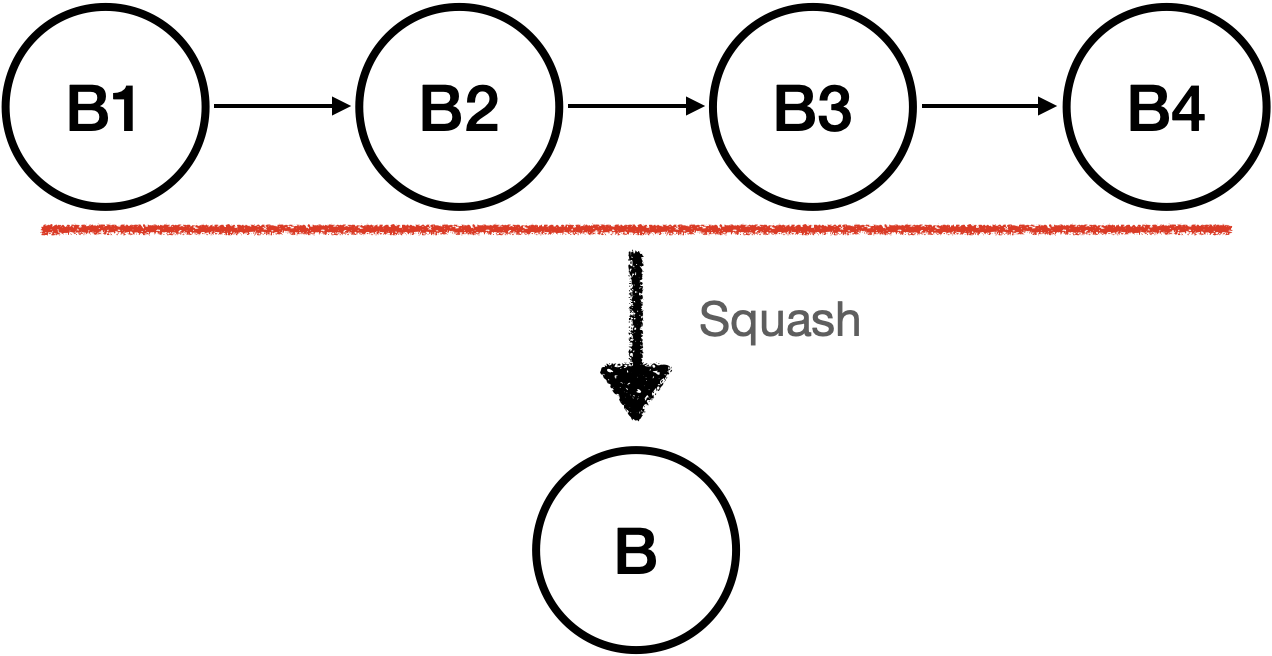 위 이미지는 위쪽의 branch를 병합할 때 일어나는 과정입니다. 위 이미지를 보시면 먼저 해당 커밋들을 합치는 squash 과정이 먼저 발생하게 됩니다. 그리고 이렇게 합친 Commit을 base 브런치에 붙이게 됩니다. 이렇게 하면 base 브런치에는 하나만의 커밋이 추가되게 됩니다.