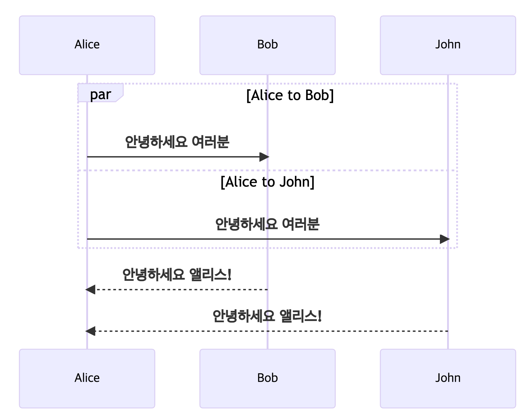 par, and, 그리고 end 구문을 이용하면 병렬로 행동하는 것 또한 가능합니다. 아래는 선생님이 모두에게 인사하고 모든 사람이 응답하는 것을 나타낸 시퀀스 다이어그램입니다.