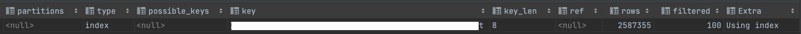 - 테이블에 접근하지 않고 인덱스만으로 결과를 만들어냈다는 의미 (커버링 인덱스)