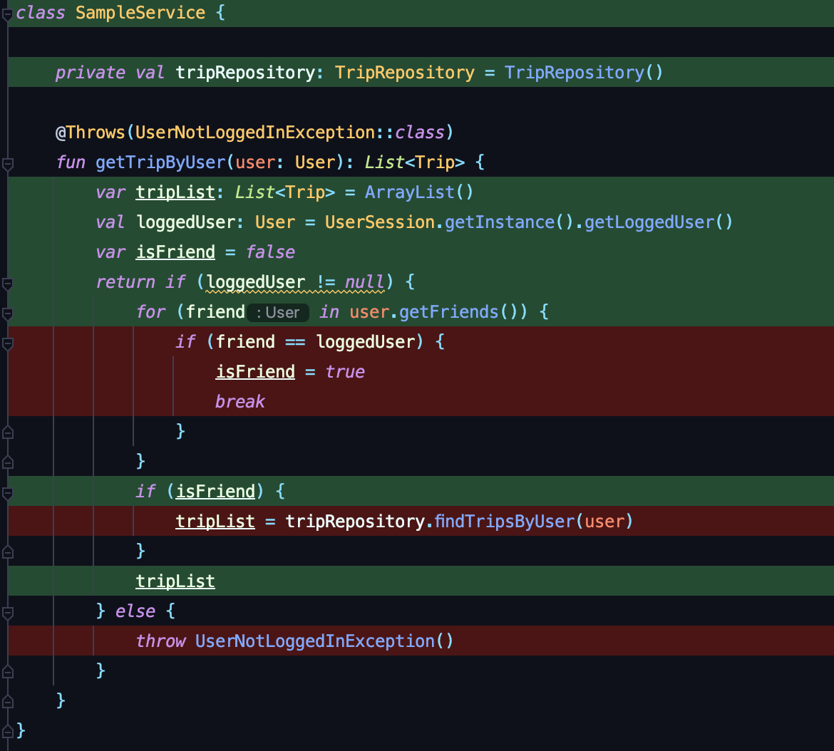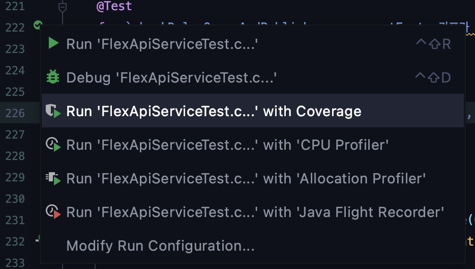 이를 클릭하시면 테스트 코드가 어느정도 커버하고 있는지를 보여주며 커버되고 있지 않는 부분은 빨간색으로, 커버되고 있는 부분은 초록색으로 표시됩니다. 테스트를 작성하며 어느정도 커버하고 있는지를 바로바로 확인할 수 있습니다.