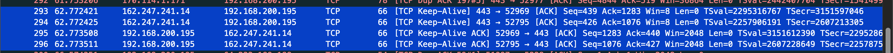 아래는 WireShark로 찍은 KeepAlive를 주고받은 메시지입니다. 66Byte의 작은 메시지로 연결이 잘 유지되고 있는지 확인하고 있는 패킷을 확인할 수 있었습니다.