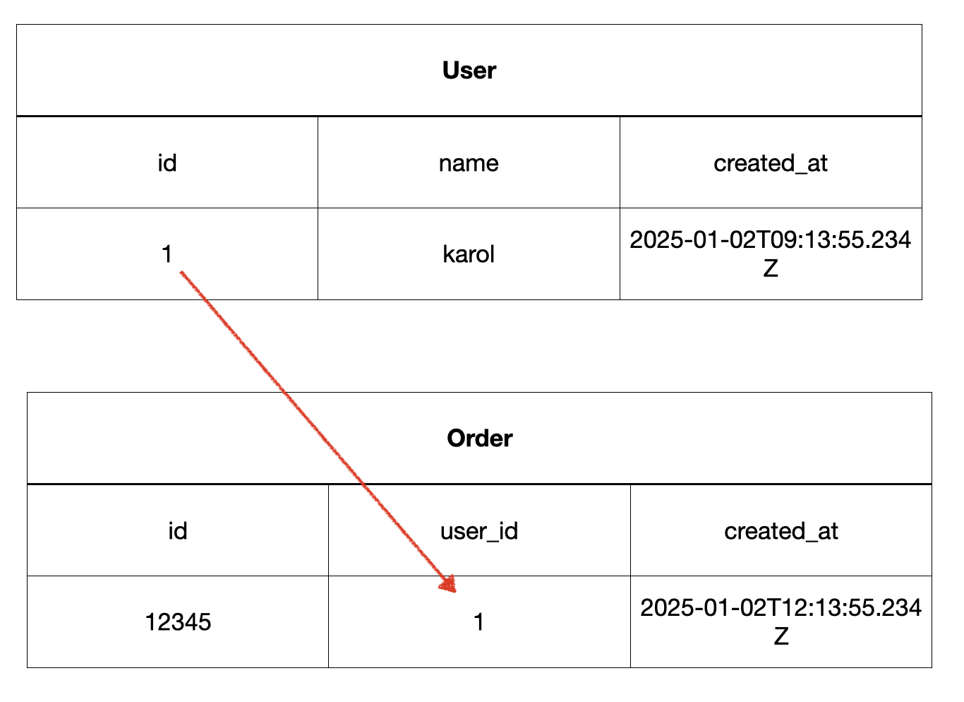 RDB의 경우 정규화를 통한 Join 메커니즘을 통해서 Entity 간의 연관관계를 달성합니다. 정규화란 데이터베이스의 중복을 최소화하고 데이터 무결성을 유지하기 위한 과정인데요. E-Commerce라고 하였을 때 유저가 주문한 리스트를 나타낸다고한다면 RDB의 경우 아래와 같이 데이터를 구성하는것이 일반적입니다.