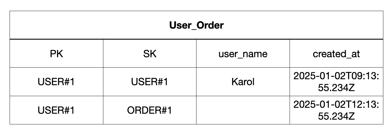 위의 RDB의 동일한 예제를 가지고 DynamoDB에 적재한다고 해보겠습니다. 그러면 아래와 같은 데이터 구조를 가질 수 있습니다. Partition Key로 User_Id를 가지고 Sorted_Key로 Order_Id를 가지도록 했습니다.