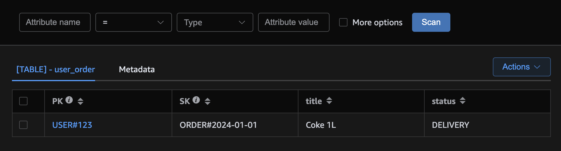 DynamoDB는 Schema에서 Key로 사용되거나 Index로 사용되는 attribute 에 대해서만 db 명세에 기술해주면 됩니다. 아래는 위 스키마로 만들고 데이터를 적재했을 때의 item을 나타냅니다. title과 status는 별도의 스키마로는 정의되어있지 않습니다. 스키마리스한 부분으로 이해해주시면 됩니다.