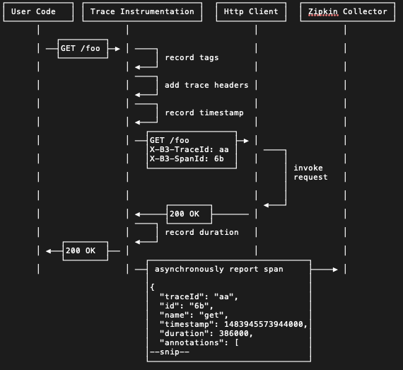 zipkin에서 데이터를 모으기 위한 시퀀스 다이어그램은 아래와 같습니다.