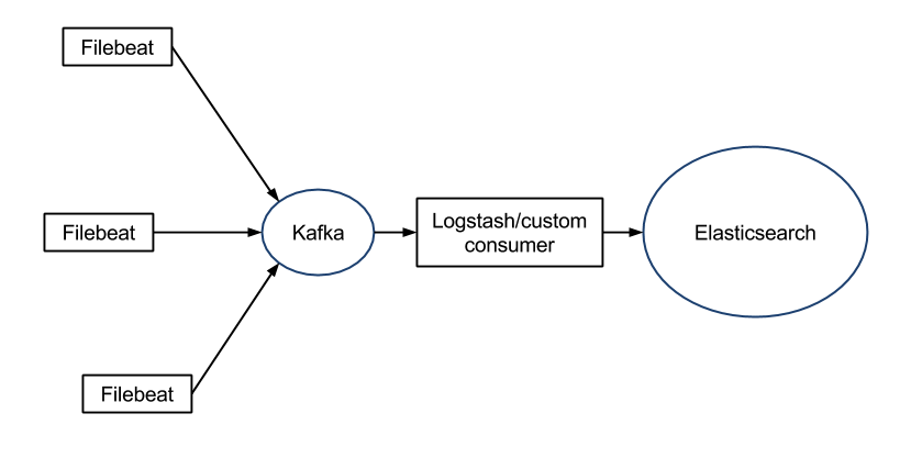 운영 상 로그를 남길 때 만약 elasticsearch가 꺼져있다면 어떨까요? 그러면 우리는 상당히 곤란해 집니다. 왜냐하면 elasticsearch가 꺼져있을 때 로그가 전달 되지 않기 때문이죠. 따라서 전달되지 못한 로그를 buffer에 가지고 있어야 할 경우가 있습니다. filebeat도 그역할을 할 수 있지만 부족한게 현실입니다. 그래서 Logstash를 사용합니다. 하지만 Logstash도 부족하다고 느껴질 때가 있습니다. 왜냐하면 Logstash는 sharding과 replication 등을 지원하지 않기 때문입니다. 그래서 kafka를 사용하기도 합니다. 아래와 같이 말이죠.