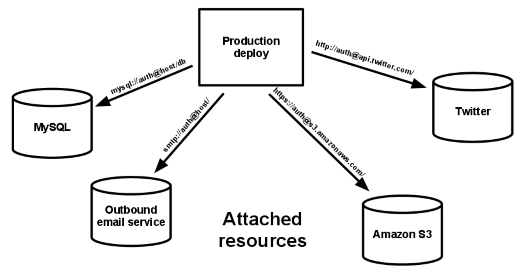 그리고 마이크로서비스에서는 이러한 Resource들에 대해서 URL에 의해서 접근가능해야 한다고 합니다. DB의 경우 jdbc://, 일반 API서버라면 http://, https:// 정도가 될 것입니다.
