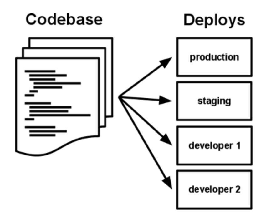 코드와 어플리케이션 사이에는 항상 1대 1 관계가 성립해야합니다.앱의 코드베이스는 한개여야하지만, 앱의 배포는 여러개가 될 수 있습니다. 개발, stage, 운영에 대해서 1개의 코드베이스를 유지한다라는 의미입니다. 아래의 이미지와 같이 말이죠.