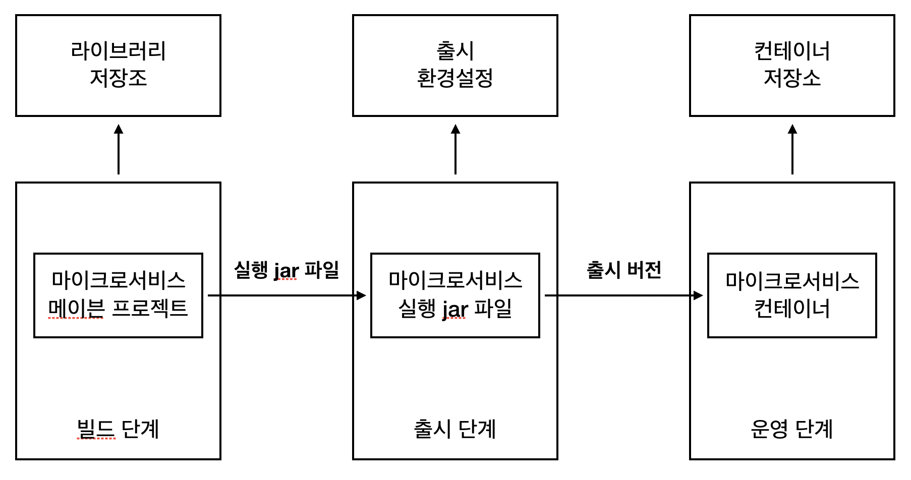 Spring에서 마이크로서비스에서 빌드란 실행 가능한 JAR 파일을 만들어낼 수 있는데, 이 실행 파일에는 HTTP 리스너와 같은 서비스 런타임 환경(톰켓 등)도 포함됩니다. 출시 단계에서는 이런 실행 파일들이 운영 환경 URL과 같은 환경설정 정보와 합쳐저 출시 버전을 만들어 내는데, 대부분 도커와 유사한 컨테이너로 만들어집니다. 운영 단계에서는 출시 단계에서 만들어낸 컨테이너가 스케줄러에 의해 운영 환경에 배포됩니다.