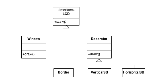 데코레이터 Class인 Decorator는 Window와 동일하게 LCD를 상위 interface로 가집니다. 그리고 생성자에 LCD를 받음으로써 실제 구현 class인 window를 받을 수 있도록 합니다.