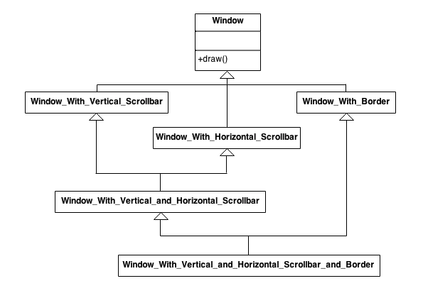 윈도우 시스템을 만든다고 가정해보겠습니다. 세로스크롤, 가로스크롤, 외곽선이 있는 웹브라우저를 만들어야 한다고 한다면 재사용성을 고려하여 위와 같이 아키텍처를 구성할 수 있습니다. 이렇게 하면 우리는 Window_WIth_Vertical_and_Horizontal_Scrollbar_Border를 상속받아 사용하면 됩니다.