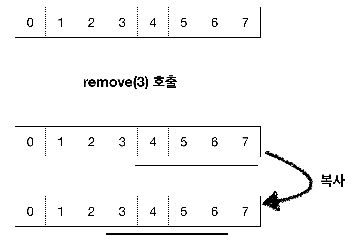 - 삭제를 할때 우리는 index + 1에서 부터의 값을 index부터 시작하게끔 복사한다는 것을 알 수 있었습니다. 그때 O(n)의 시간복잡도를 가지며 마지막 값을 null로 변경해줍니다. 이때는 O(1)을 가지겠죠. 삭제에 대해서는 항상 시간복잡도 O(n)을 가진다는 것을 알 수 있습니다.