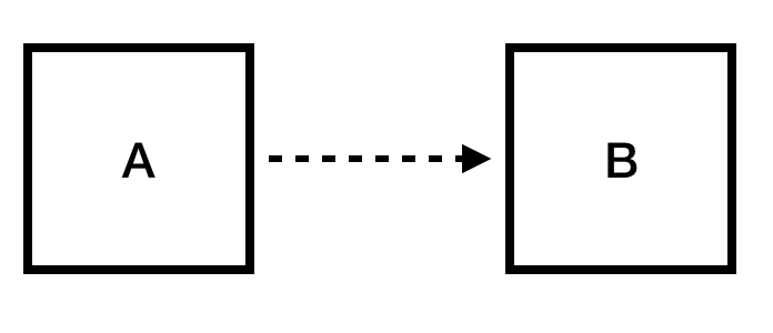 위 UML 모델은 의존성을 표현한 것입니다. A는 B에 의존하고 있다는 표현입니다.
