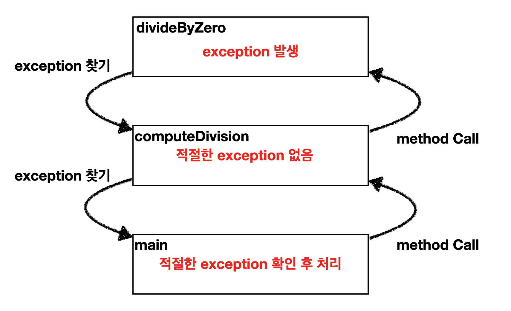 위 코드를 보도록 하겠습니다. 위 코드는 main -> computeDivision -> divideByZero 으로 호출을 하게 되고 divideByZero 메서드에서 0으로 나누기 때문에 RuntimeException 중 하나인 ArithmeticException이 발생하게됩니다. 하지만 해당 method에는 처리할 수 있는 catch가 존재하지 않기 때문에 이전 메서드인 computeDivision 메서드로 돌아가 적절한 exception 처리가 있는지 확인하며 해당 메서드에도 없는것을 확인한 후 main으로 넘어와 적절한 exception 처리가 이루어지며 결과적으로 출력되는 결과는 exception in main catch가 됩니다.
