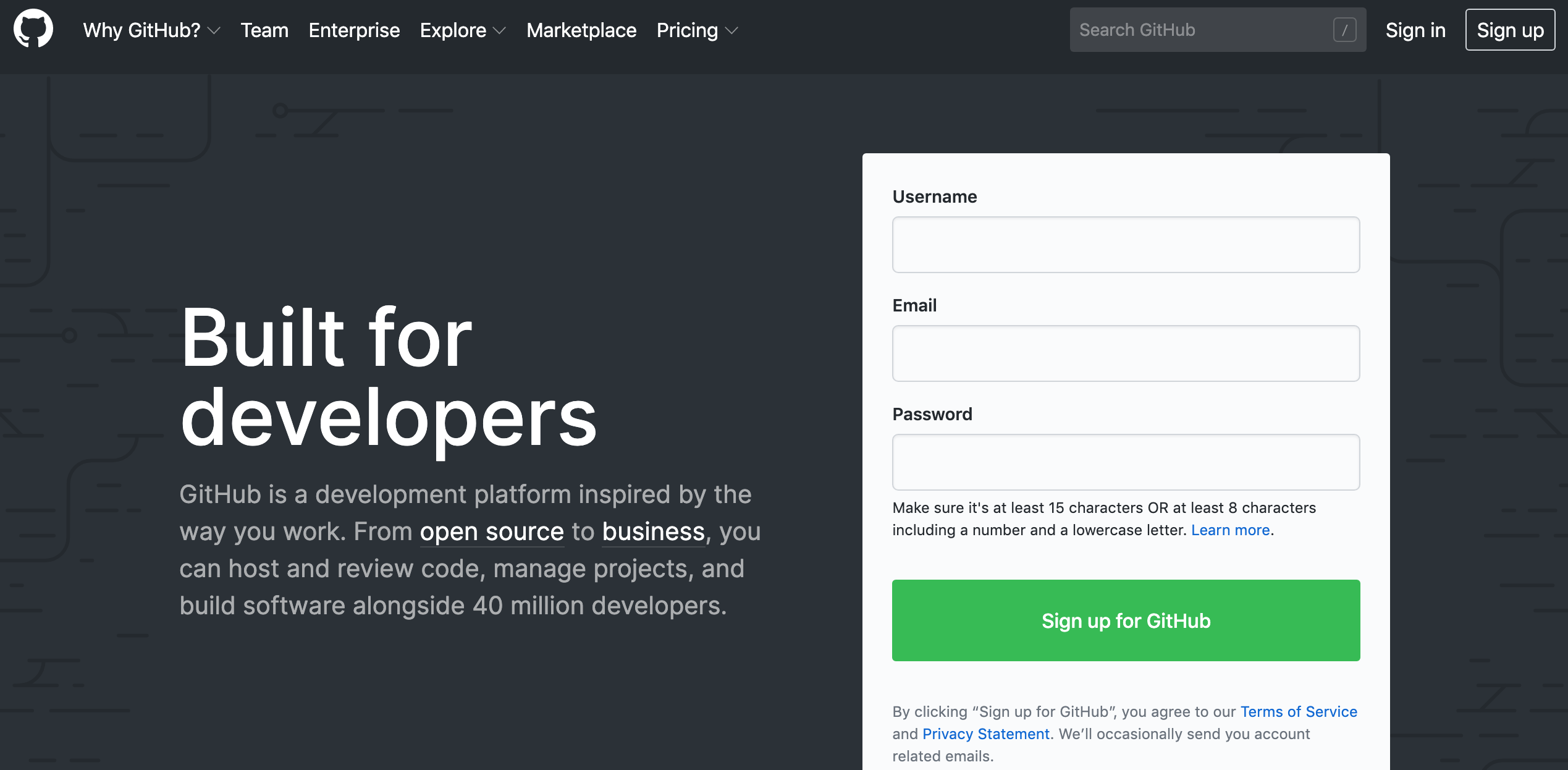 github에 먼저 원격 저장소를 생성해보도록 하겠습니다. github 사이트(http://github.com)에 접속하시면, 아래와 같은 페이지가 출력될 것입니다. 만약 처음으로 회원가입을 원하면 sign up을 로그인을 원하시면 sign in을 클릭해서 진행합니다.
