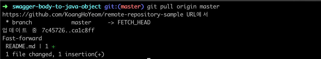 pull 명령어는 원격저장소에서 fetch명령어로 가져온 후 merge까지 한번에 해 실제 파일의 내용이 변경되는 명령어입니다. 명령어는 git pull <원격 저장소 명> <branch 명>입니다.