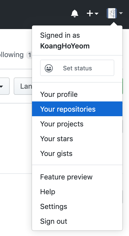 로그인 후 좌상단의 프로필을 누르고 Your Repository를 클릭합니다.