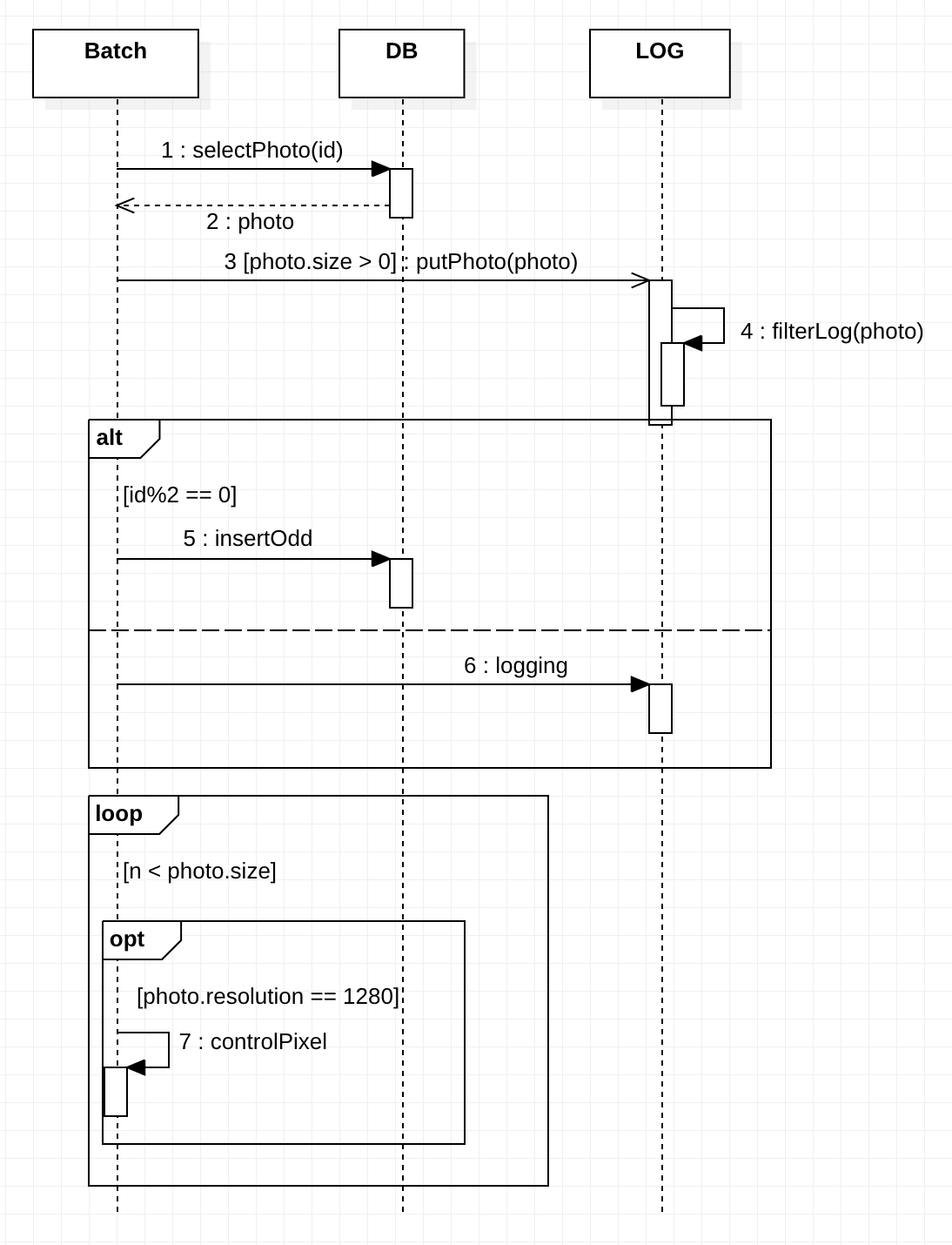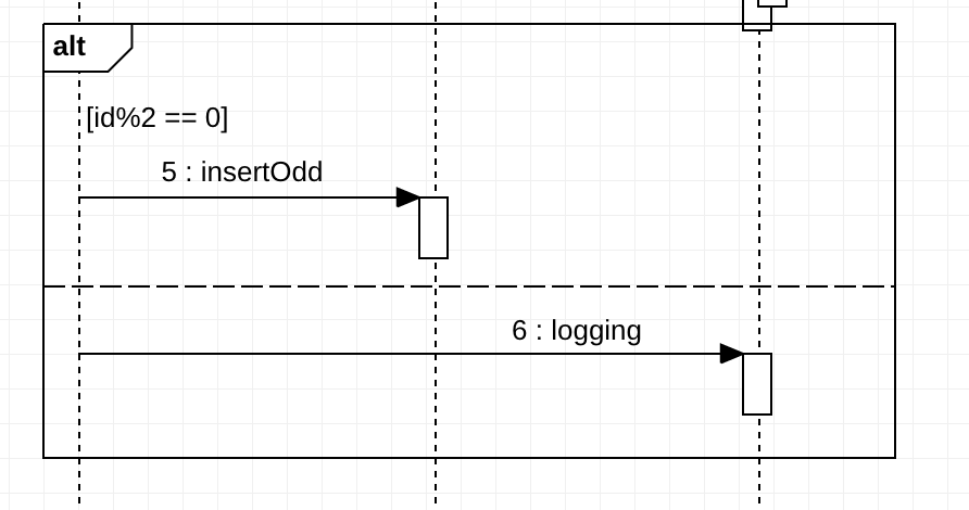 alternatives는 줄여서 alt로 표기합니다. 이 타입은 if / else 구문을 나타낼 수 있습니다. 아래의 예제를 보겠습니다. 아래는 alt를 이용한 if / else 구문입니다. 여기서도 if에 대해서 guard를 사용할 수 있습니다. guard를 보시면 id값이 짝수일 경우 입니다. 즉 이 시퀀스 다이어그램은 id가 짝수이면 insertOdd 메시지를 보내고 그렇지 않다면 logging이라는 메시지를 보내는것을 알 수 있습니다.