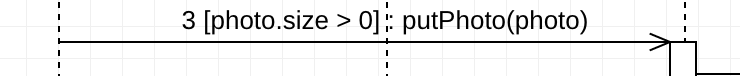 먼저 guard에 대해서 알아보도록 하겠습니다. guard는 단일 메시지에 대해서 조건을 명시할 수 있는 방법입니다. guard는 메시지의 Text의 앞쪽에 []로 감싼 후 조건을 명시하면 됩니다. 만약 a라는 값이 0보다 커야한다고 한다면 [a>0]으로 명시하면 좋습니다. 아래 이미지는 photo의 갯수를 불러오고 photo.size의 값이 0보다 크다면 putPhoto(photo)로 호출한다는 의미입니다. 만약 size가 0이라면 해당 메시지는 발생하지 않습니다.