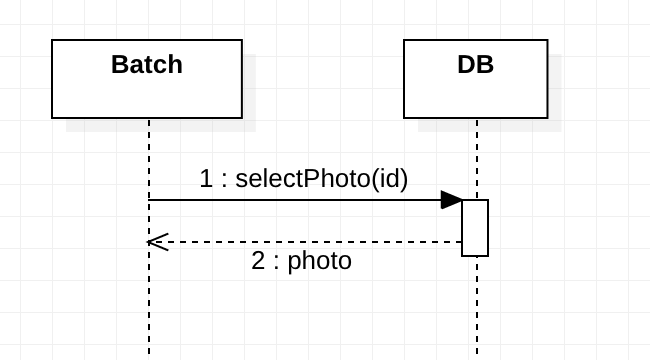 call message는 요청을 하는 메시지입니다. 메시지에 대해서 받은 인스턴스는 특정 작업을 진행할 것입니다. 그리고 작업을 마무리하고 return message를 돌려줍니다. call message를 통해 호출할 때 호출이름(파라미터)의 형식을 가집니다. 그리고 response에 대해서는 반환되는 값을 명시해주시면 됩니다. 아래 이미지는 DB 서비스에 selectPhoto를 실행시키며 파라미터로 id를 전달했습니다. 그리고 DB의 작업 후 photo를 Batch 인스턴스에 return하는 모습을 나타낸 것입니다.