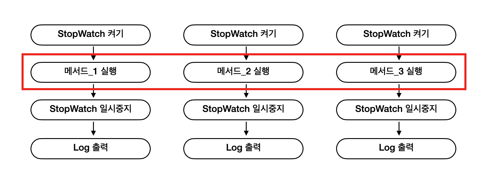 - N개의 메서드가 있을 때 N개의 시간측정 메서드가 필요하며 만약 Log출력에서 Log내용을 바꿔야한다면 N번 작업해야한다.